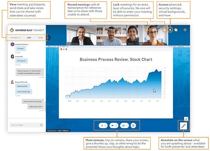 Meet face-to-face with your team and clients with Univerge Blue Meet – included with every Connect plan. Increase collaboration with audio, video, screen sharing, and in-meeting chat from any device. Meet is fully integrated with the Univerge Blue Connect apps, so chat conversations can easily become video meetings.