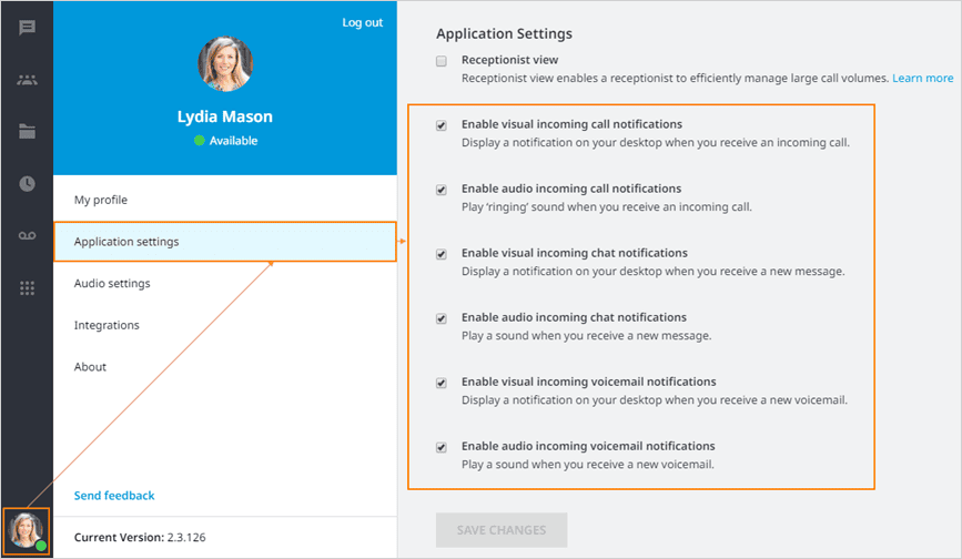 You can customize how you would like to receive audio and visual notifications for incoming calls, new voicemails, and new chat messages.