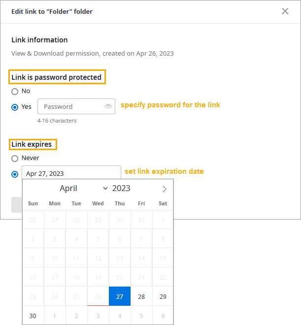 - Under the submenu "Link is password protected", click the checkbox next to YES